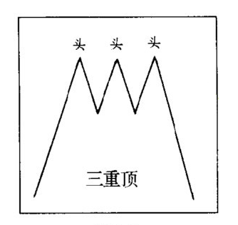 三重顶(Triple Top)又称为三尊头。它是以三个相约之高位而形成的转势图表形态,通常出现在上升市况中。典型三重顶,通常出现在一个较短的时期内及穿破支持线而形成。另一种确认三重顶讯号,可从整体的成交量中找到。当图形形成过程中,成交量随即减少,直至价格再次上升到第三个高位时,成交量便开始增加,形成一个确认三重顶讯号。 最低点的形成,投资者通常以它作为主要支持线,当价格出现双顶后回落至接近颈线(支持位),然后再次反弹至原先双顶的位置,并遭遇阻力后回落。若价格跌破颈线,便会大幅滑落,三重顶图形已被确认。 上述例子显示,当价格上升到A点,交易徘徊在这区域约一个多月后,仍未成功穿破B点与C点之阻力位。因没有需要之情况下,价格开始回落,而且跌破三重顶图形的支持位,确认了向淡趋势图形。随后再升回此价位,尝试穿破这图形形成的阻力位(前市的支持位)。