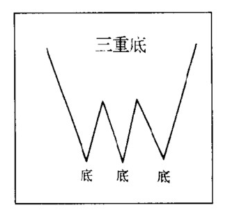 三重底(Triple Bottom)是三重顶形态的倒影,在跌市中以三点相约之低点而形成。在价格向上摆动时,发出重大转向讯号。与三重顶相比,三重底图形通常拖延数月时间及穿破阻力线才被确认为三重底图形。另一种确认三重底讯号,可从成交量中找到。当图形过程中,成交量会减少,直至价格再次上升到第三个低位时,成交量便开始增加,形成一个确认三重底讯号。 最高点的形成,投资者通常以它作为主要阻力线,价格出现双底后回升至接近颈线,重遇阻力回落至双底水平的支持位。价格未能跌破此支持位,而当其时成交量骤减,并开始反弹,成交量随即大增。当价格升越颈线时,成交量激增。在价格向上突破颈线后,三重底图形已被确认。 上述例子显示,当价位下降至A点,交易随即徘徊在这区域约四个月,但未能穿破B点和C点的支持位。因供过于求,价格开始上升至前市的某些高位。三重底的阻力位(即上图的高线),以及再升破阻力位。三重底形态因而确认。随后又再次回调到一个新的支持位(即前市的阻力位),但未能转为牛市,这更能增强三重底图形的力量。