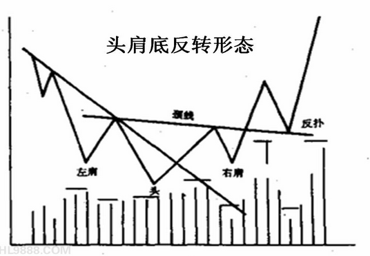 头肩底(Head & Shoulders Bottom)跟随下跌市势而行,并发出市况逆转的讯号。顾名思义,图形以左肩、头、右肩及颈线组成。三个连续的谷底以中谷底(头)最深,第一及最后谷底(分别为左、右肩)较浅及接近对称,因而形成头肩底形态。当价格一旦升穿阻力线(颈线),则出现较大幅上升。 成交量可为头肩底形态充当一个重要的指标,大多数例子中,左肩较右肩和头部为大,下降的成交量加上头部创新低可充当一个警号,警戒市势正在水平线上逆转。 第二个警号是当价格由头部的顶峰上升时,即价格向上突破颈线后,再次回落至颈线支持位,然后才大升。最后逆转讯号是在价格向上窗破颈线后,把握时机入货,若未能跟进,则可望出现「后抽」回试颈线支持位时买入。 在大多数图形中,当阻力线被穿破,相同的阻力线在后市中转变为支持线。 上述图例,左肩A点形成在一个正下跌及整固的市况。颈线从A点开始形成后,再次回落约一个月,形成头部。随后价格开始反弹,到B点再度回落,形成右肩。直到颈线的第二点出现,成为阻力线(即B点)。价格随后因有大量成交而上升穿破阻力位(颈线),头肩底图形从而确认。升破颈线后,可能有抽后情况发生,如不跌穿颈线,市势将向着目标幅度而上升。 从以上例子得知,投资者不一定会即时追随已破头肩底颈线的股票。通常,价格会再次回落到支持位(如C点)给投资者另一个买入机会。